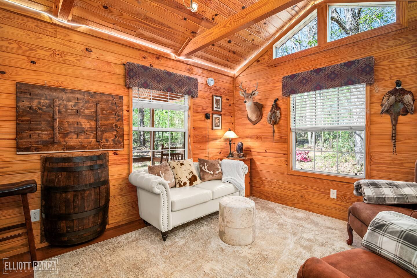 A secluded one‑bedroom forest lodge offering a boutique wellness experience with private access to a Finnish barrel sauna, outdoor shower, and curated spa packages. Enjoy a commercial griddle and wood burning pizza oven on the cooking porch and, on the separate grilling patio, a smokeless firepit, ample seating, and a full grill. Lush landscaping cocoons the cabin, with adjacent 200+ acres of forest and creeks for hiking, fishing, and slow, restorative days. Fiber internet access for streaming.