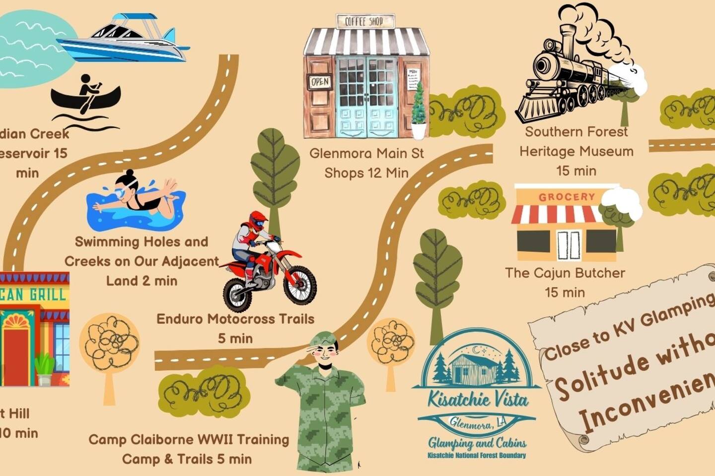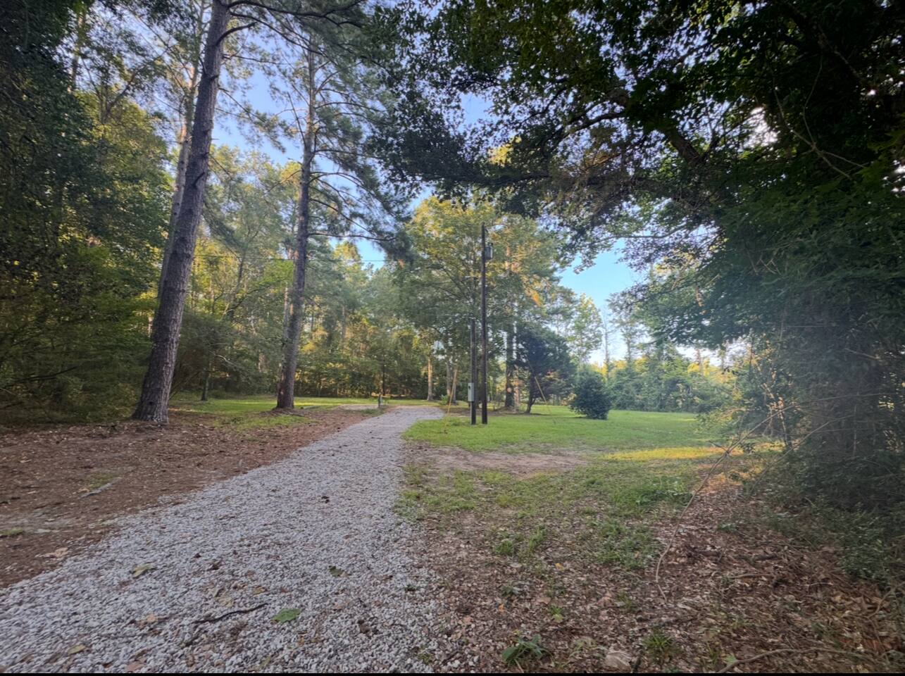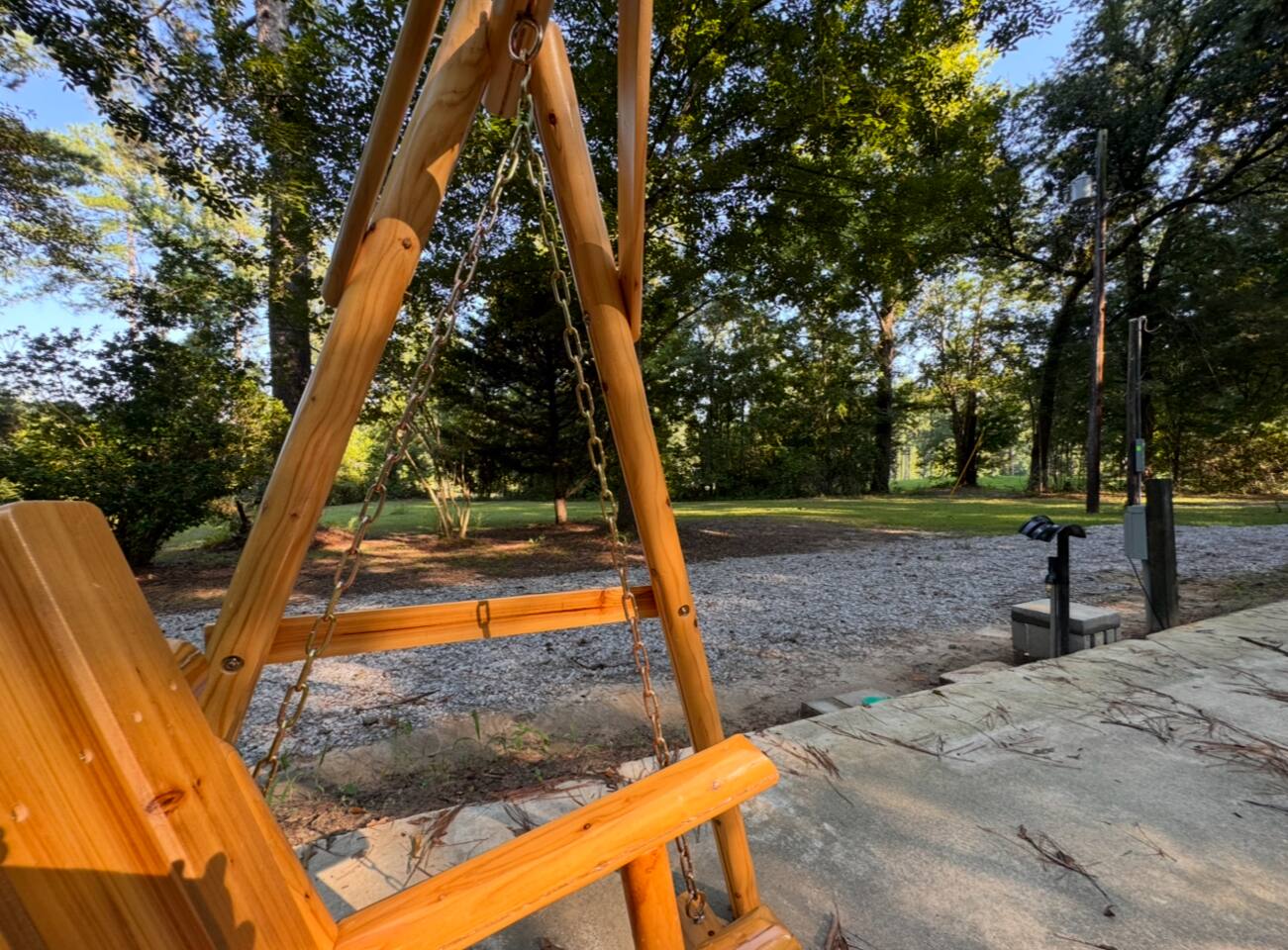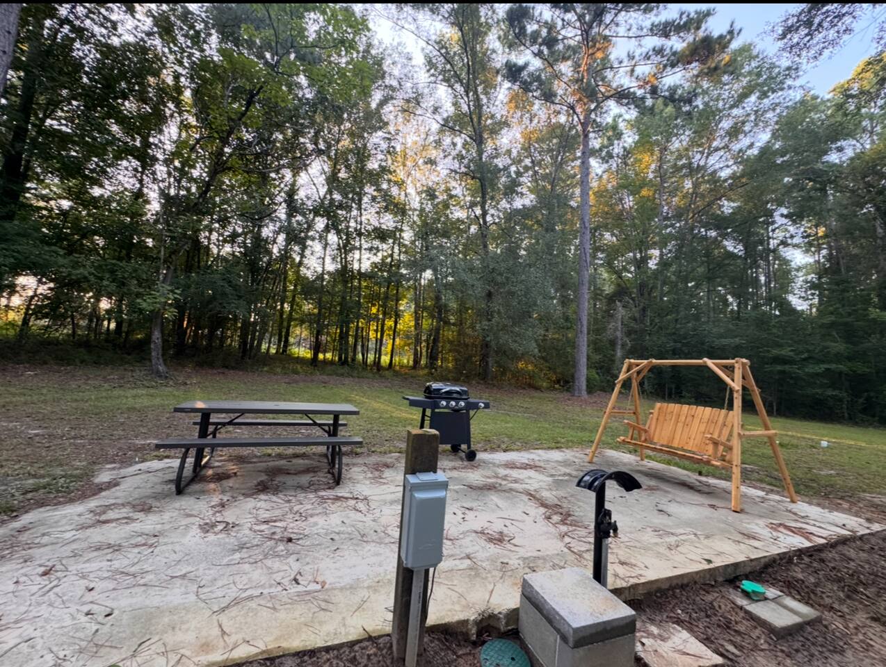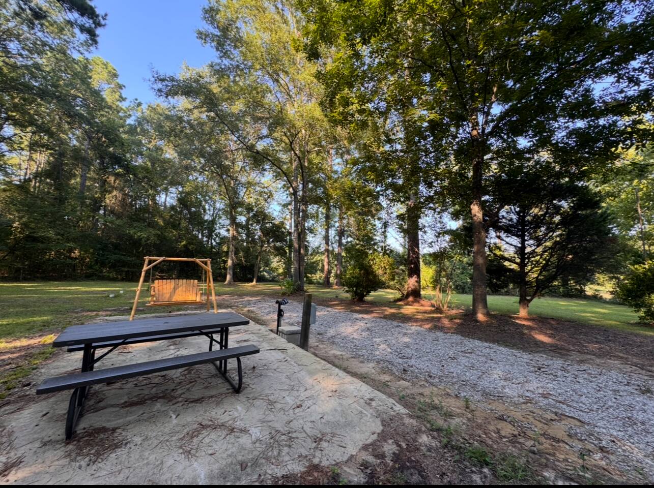 This private full hookup site includes a limestone driveway and parking pad along with a concrete patio with cedar swing, propane grill and picnic table. The one acre site is very private and shaded. We had trimmed trees and tested the turn in with our own camper. Feel free to reach out with any questions on length. We are located just a few minutes from Camp Claiborne and near the Loran OHV trails. Our glamping retreats are right in the heart of the Kisatchie trail system.